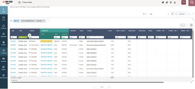This list view comes with all of the features of the other list views in SPP; you can set (and save) advanced filters, add/remove columns, view column totals, download it, or perform bulk actions (Admins only, and bulk action options are limited). Additionally, if you have the role permission “View timesheets and time entries as links on time entry list views” enabled, you can click the link in the “Timesheet Name” column to easily navigate to the timesheet that the time entry belongs to.