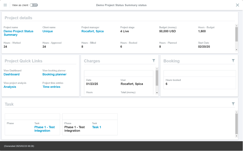 The Project Status Summary (PSS) feature allows you to create customizable project status page, offering a clear overview of important project details such as project progress, financials or budget, quick links to key areas (like the dashboard, time entries, and financial analysis), project notes, and outstanding charges of the project. You can tailor the view to display only relevant information, and there’s an option to control what clients see, ensuring they access only the data you want to share.