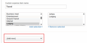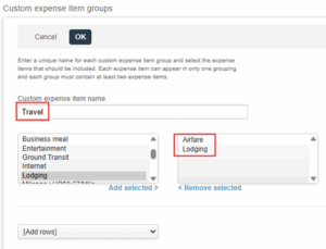 7. You can select the ‘Add rows’ drop down to create as many custom groups as needed to group various combinations of different expense item categories. Here we have grouped airfare and lodging as ‘Travel’, but as shown in the example below, you can also add additional groups as needed.