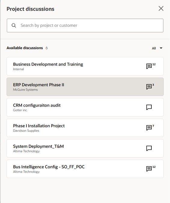 Clicking this icon displays a comprehensive list of all available project discussions to which the logged-in user has access. A particularly useful feature is the notification system: an icon next to each discussion shows the number of messages in that discussion thread that are unread by the user, helping team members stay current on project communications.