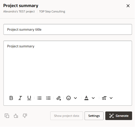 From here, you can give the summary a title, choose from four available content options to include in the auto-generated summary (via the Settings button), and click the Generate button to produce an AI summary of the project which will populate in the Project Summary text box. After the summary has been generated, you can manually modify or add any desired changes to the text before clicking “Save summary.”