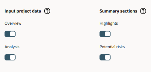 The content options that are available to be incorporated into the AI-generated summary include data from one of (or both) the project’s Project Overview report (located under the project’s Reports > Overview tab) and Financial Analysis report (located under the project’s Financials > Analysis tab). You can also choose to include a summarized Highlights and/or Potential Risks section (both are optional).
