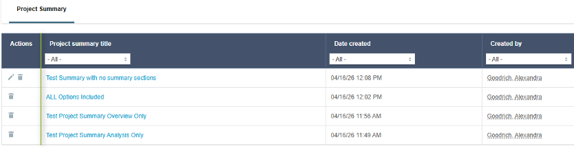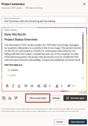 Multiple project summaries can be created and saved throughout the project’s lifespan and are stored in the Project Summary section; however, only the most recently-generated summary is available to be edited. You can view the project data (Overview, Analysis, or both) that was used to generate the report (within the most recently-generated project summary only) by clicking the pencil (edit) icon > Show project data.