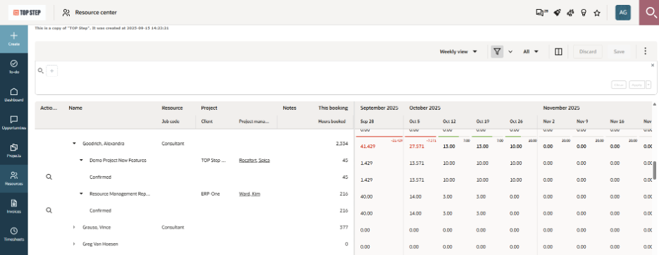 The new Resource Center provides a centralized hub for resource managers to track and perform a variety of resource allocation activities in one place. Similar to the Project Center, the Resource Center features a customizable booking grid with weekly or monthly view options and direct, inline-editing capabilities. However, unlike the Project Center, the Resource Center is not project-specific and allows you to get a holistic view of booking data at the level of your choice—organization-wide, by specific user(s), client(s), project stage, etc.—by utilizing advanced filters.