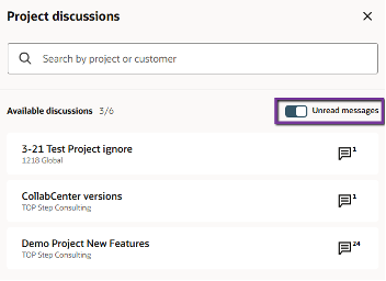 - You can toggle the “Unread messages” switch to view ALL project discussions with currently unread messages