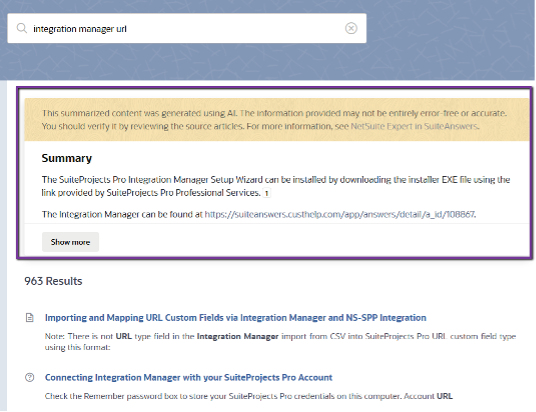 After typing 3 or more words into the search bar in SuiteAnswers, NetSuite Expert will automatically generate a summarized response using AI above the list of results.